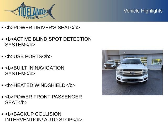 *POWER DRIVER'S SEAT*, *ACTIVE BLIND SPOT DETECTION SYSTEM*, *USB PORTS*, *BUILT IN NAVIGATION SYSTEM*, *HEATED WINDSHIELD*, *POWER FRONT PASSENGER SEAT*, *BACKUP COLLISION INTERVENTION/ AUTO STOP*, *LEATHER SEATS*, *VOICE ACTIVATED CONTROLS*, *BluetoothĀ® STREAMING*, *PUSH-BUTTON IGNITION*, *FORWARD-COLLISION WARNING (FCW)*, *AUTOMATIC EMERGENCY BRAKING (AEB)*, *REAR CROSS TRAFFIC ALERT*, *BLIND-SPOT MONITORING*, *360-DEGREE SURROUND-VIEW CAMERA SYSTEM*, *APPLE CarPlay*, *ANDROID AUTO*, 4WD, All Services Up To Date, Leather Seats, Parking Sensors, Push Button Start, Remote Start, Towing Package, USB, Backup Camera/ Rearview Camera, Sirius XM Radio, Rain Sensing Windshield Wipers, Memory Seat, Power Seats, Steering Wheel Controls, 4WD, 10 Speakers, 20 Polished Aluminum Wheels, 4-Wheel Disc Brakes, 4x4 FX4 Off-Road Bodyside Decal, ABS brakes, Active Park Assist, Adaptive Cruise Control, Adjustable pedals, Air Conditioning, All-Weather Rubber Floor Mats, Alloy wheels, AM/FM radio: SiriusXM, AppLink/Apple CarPlay and Android Auto, Auto High-beam Headlights, Auto tilt-away steering wheel, Auto-dimming door mirrors, Auto-dimming Rear-View mirror, Automatic temperature control, Black Unique Multi-Contour Leather Bucket Seats, Box Side Steps, Brake assist, Bumpers: body-color, CD player, Class IV Trailer Hitch Receiver, Compass, Delay-off headlights, Driver door bin, Driver vanity mirror, Dual front impact airbags, Dual front side impact airbags, Electronic Locking w/3.31 Axle Ratio, Electronic Stability Control, Emergency communication system: SYNC 3 911 Assist, Equipment Group 701A Luxury, Exterior Parking Camera Rear, Foldable Pickup Box Bed Extender, Front anti-roll bar, Front Bucket Seats, Front Center Armrest, Front dual zone A/C, Front fog lights, Front reading lights, Front wheel independent suspension, Fully automatic headlights, FX4 Off-Road Package, Garage door transmitter, Genuine wood door panel insert, GVWR: 7,050 lbs Payload Package, Heated door mirrors, Heated front seats, Heated rear seats, Heated steering wheel, Higher-Capacity Radiator, Higher-Power Cooling Fans, Hill Descent Control, Illuminated entry, Integrated Trailer Brake Controller, Lane-Keeping System, Low tire pressure warning, Memory seat, Navigation System, Occupant sensing airbag, Off-Road Tuned Front Shock Absorbers, Outside temperature display, Overhead airbag, Overhead console, Panic alarm, Passenger door bin, Passenger vanity mirror, Pedal memory, Power door mirrors, Power driver seat, Power passenger seat, Power steering, Power windows, Pro Trailer Backup Assist, Radio data system, Radio: B&O Play Premium Audio System, Rain sensing wipers, Rear Parking Sensors, Rear reading lights, Rear seat center armrest, Rear step bumper, Rear window defroster, Remote keyless entry, Security system, Speed control, Speed-sensing steering, Split folding rear seat, Steering wheel memory, Steering wheel mounted audio controls, SYNC 3, Tachometer, Tailgate Step w/Tailgate Lift Assist, Technology Package, Telescoping steering wheel, Tilt steering wheel, Traction control, Trailer Tow Package, Trip computer, Turn signal indicator mirrors, Twin Panel Moonroof, Upgraded Front Stabilizer Bar, Variably intermittent wipers, Ventilated front seats, Voice-Activated Touchscreen Navigation System, Voltmeter.