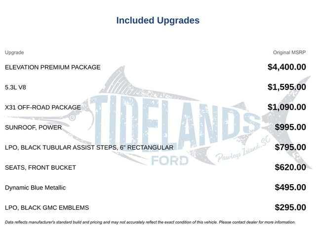 All Services Up To Date, 10-Speed Automatic, 4WD, Black Leather, 10-Way Power Driver Seat Adjuster w/Lumbar, 120-Volt Bed Mounted Power Outlet, 120-Volt Instrument Panel Power Outlet, 170 Amp Alternator, 2 Charge/Data USB Ports, 2 Charge/Data USB Ports Inside Center Console, 2 Type-C Charge-Only Rear USB Ports, 220 Amp Alternator, 4-Way Manual Passenger Seat Adjuster, 4-Wheel Disc Brakes, 6 Speakers, 6-Speaker Audio System Feature, 6 Rectangular Black Tubular Assist Steps (LPO), ABS brakes, Adaptive Cruise Control, Air Conditioning, Alloy wheels, AM/FM radio: SiriusXM with 360L, Apple CarPlay/Android Auto, Auto High-beam Headlights, Auto-Locking Rear Differential, Automatic Emergency Braking, Automatic temperature control, Auxiliary External Transmission Oil Cooler, Black GMC Emblems (LPO), Body Color Header w/Gloss Black Mesh Grille Bars, Brake assist, Buckle to Drive, Bumpers: body-color, Cloth Rear Seat w/Storage Package, Cloth Seat Trim, Color-Keyed Carpeting Floor Covering, Compass, Deep-Tinted Glass, Delay-off headlights, Driver door bin, Driver vanity mirror, Dual Exhaust System, Dual front impact airbags, Dual front side impact airbags, Electric Rear-Window Defogger, Electrical Steering Column Lock, Electronic Precision Shift, Electronic Stability Control, Elevation Premium Package, Emergency communication system: OnStar and GMC Connected Services capable, Exterior Parking Camera Rear, External Engine Oil Cooling, Floor-Mounted Center Console, Following Distance Indicator, Forward Collision Alert, Front 40/20/40 Split-Bench Seat, Front anti-roll bar, Front Bucket Seats, Front Center Armrest w/Storage, Front dual zone A/C, Front fog lights, Front Frame-Mounted Black Recovery Hooks, Front Pedestrian Braking, Front reading lights, Front Rubberized-Vinyl Floor Mats, Front wheel independent suspension, Fully automatic headlights, GMC Connected Access Capable, HD Rear Vision Camera, HD Surround Vision, Heated door mirrors, Heated Driver & Front Outboard Passenger Seating, Heated front seats, Heated Steering Wheel, Heated steering wheel, Heavy-Duty Air Filter, High Capacity Suspension Package, High Gloss Black Mirror Caps, Hill Descent Control, Hitch Guidance, Hitch Guidance w/Hitch View, Illuminated entry, In-Vehicle Trailering App, Integrated Trailer Brake Controller, IntelliBeam Automatic High Beam On/Off, Keyless Open & Start, Lane Keep Assist w/Lane Departure Warning, Leather-Appointed Seat Trim, LED Cargo Area Lighting, Low tire pressure warning, Manual Tilt-Wheel & Telescoping Steering Column, Navigation System, Not Equipped w/Dynamic Fuel Management, Not Equipped w/Rear Park Assist, Occupant sensing airbag, Off-Road Suspension, OnStar & GMC Connected Services Capable, Outside temperature display, Overhead airbag, Overhead console, Panic alarm, Passenger door bin, Passenger vanity mirror, Perimeter Lighting, Power Door Locks, Power door mirrors, Power driver seat, Power Front Windows w/Driver Express Up/Down, Power Front Windows w/Passenger Express Down, Power Rear Windows w/Express Down, Power Sliding Rear Window w/Rear Defogger, Power steering, Power Sunroof, Power windows, Preferred Equipment Group 3SB, Preferred Package, Premium audio system: GMC Infotainment System, Premium Bose 7-Speaker Sound System, Push Button Start, Radio: Premium GMC Infotainment Audio System, Rear Cross Traffic Braking, Rear Pedestrian Detection, Rear reading lights, Rear Rubberized-Vinyl Floor Mats, Rear seat center armrest, Rear step bumper, Rear Wheelhouse Liners, Rear window defroster, Remote keyless entry, Remote Vehicle Starter System, Security system, Sierra Safety Plus Package, SiriusXM w/360L, Speed control