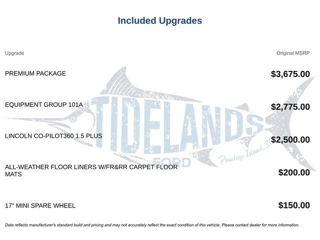 19 Premium Painted Aluminum Wheels, 360-Degree Camera w/Front & Rear Camera Washer, 60/40 EasyFold Rear Seat w/Power Seatback Release, Active Park Assist 2.0, Ambient Lighting, Convenience Package, Elements Package, Equipment Group 101A, Evasive Steering Assist (ESA), Front/Side/Rear Parking Sensors, Heated Rear Seat, Heated Steering Wheel, Heated/Ventilated Driver & Front Passenger Seats, Intelligent Adaptive Cruise Control, Lincoln Co-Pilot360 1.5 Plus, Panoramic Vista Roof w/Power Shade, Premium Leather-Trimmed Comfort Seats, Premium Package, Rain Sensing Wipers, Reverse Brake Assist, Universal Garage Door Opener, Ventura Leather-Wrapped Steering Wheel, Voice-Activated Touchscreen Navigation System, Windshield Wiper De-Icer.