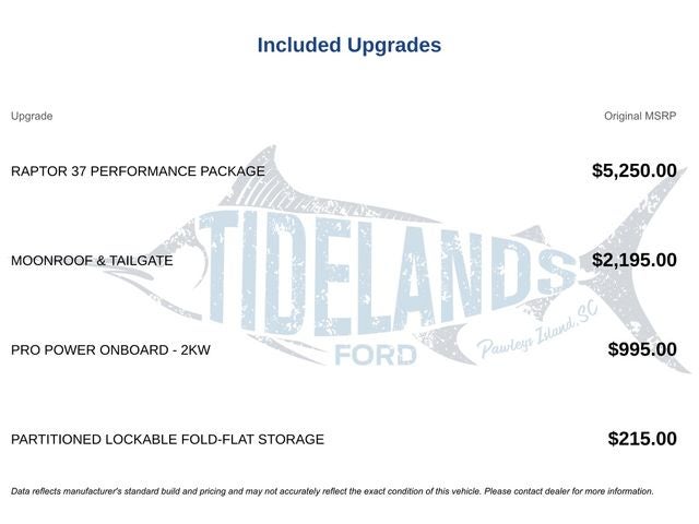*POWER DRIVER'S SEAT*, *ACTIVE BLIND SPOT DETECTION SYSTEM*, *USB PORTS*, *BUILT IN NAVIGATION SYSTEM*, *HEATED WINDSHIELD*, *POWER FRONT PASSENGER SEAT*, *BACKUP COLLISION INTERVENTION/ AUTO STOP*, *LEATHER SEATS*, *VOICE ACTIVATED CONTROLS*, *BluetoothĀ® STREAMING*, *PUSH-BUTTON IGNITION*, *FORWARD-COLLISION WARNING (FCW)*, *AUTOMATIC EMERGENCY BRAKING (AEB)*, *REAR CROSS TRAFFIC ALERT*, *BLIND-SPOT MONITORING*, *360-DEGREE SURROUND-VIEW CAMERA SYSTEM*, *APPLE CarPlay*, *ANDROID AUTO*, 4WD, All Services Up To Date, BluetoothĀ® Streaming Audio, Parking Sensors, Push Button Start, Remote Start, Off Road Package, Navigation, Backup Camera/ Rearview Camera, Rain Sensing Windshield Wipers, Steering Wheel Controls, 4WD, 18 Speakers, 4-Wheel Disc Brakes, ABS brakes, Adaptive suspension, Adjustable pedals, Air Conditioning, Alloy wheels, AM/FM radio: SiriusXM with 360L, Auto High-beam Headlights, Auto Start-Stop Removal (DISC), Auto tilt-away steering wheel, Auto-dimming door mirrors, Auto-dimming Rear-View mirror, Automatic temperature control, Brake assist, Bumpers: body-color, Compass, Delay-off headlights, Driver door bin, Driver vanity mirror, Dual front impact airbags, Dual front side impact airbags, Electronic Locking w/4.10 Axle Ratio, Electronic Stability Control, Emergency communication system, Equipment Group 801A Standard, Exterior Parking Camera Rear, Front anti-roll bar, Front Bucket Seats, Front Center Armrest, Front dual zone A/C, Front fog lights, Front reading lights, Front wheel independent suspension, Fully automatic headlights, Garage door transmitter, GVWR: 7,300 lbs Payload Package, Heated door mirrors, Heated front seats, Heated rear seats, Heated steering wheel, Illuminated entry, Inclination/Intrusion Sensor Removal, Lane Departure Warning System, Leather Trim Seats w/Heated 2nd Row, Low tire pressure warning, Memory seat, Moonroof & Tailgate, Navigation system: Connected Navigation, Occupant sensing airbag, Outside temperature display, Overhead airbag, Overhead console, Panic alarm, Partitioned Lockable Fold-Flat Storage, Passenger door bin, Passenger vanity mirror, Pedal memory, Power door mirrors, Power driver seat, Power passenger seat, Power steering, Power Tailgate, Power windows, Pro Power Onboard - 2KW, Radio data system, Radio: B&O Unleashed Sound System by Bang & Olufsen, Rain sensing wipers, Raptor 37 Graphics, Raptor 37 Performance Package, Rear reading lights, Rear step bumper, Rear window defroster, Remote keyless entry, Security system, Speed control, Speed-sensing steering, Split folding rear seat, Sport Tuned Shock Absorbers, Steering Wheel Heat Removal (DISC), Steering wheel memory, Steering wheel mounted audio controls, SYNC 4 w/Enhanced Voice Recognition, Tachometer, Telescoping steering wheel, Tilt steering wheel, Traction control, Trip computer, Turn signal indicator mirrors, Twin Panel Moonroof, Variably intermittent wipers, Ventilated front seats, Wheels: Unique 17 Forged Aluminum Bead-Lock Capable.