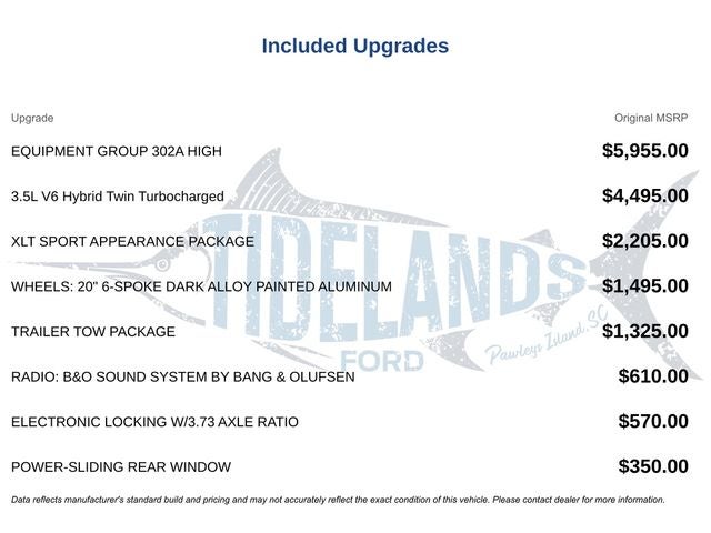 3.5L PowerBoost Full-Hybrid V6, 4WD, 10-Way Power Driver & Passenger Seats, 2-Bar Style Grille w/Chrome 2 Minor Bars, 8 Productivity Screen in Instrument Cluster, Accent-Color Step Bars, Auto-Dimming Rear-View Mirror, Black 2-Bar Style Grille w/Black Surround/Accents, Body-Color Door & Tailgate Handles, Body-Color Front & Rear Bumpers, Box Side Decals, Bright Polished Step Bars, Chrome Door & Tailgate Handles w/Body-Color Bezel, Chrome Single-Tip Exhaust, Class IV Trailer Hitch Receiver, Dual Zone Electronic Automatic Temperature Control, Equipment Group 302A High, Heated Front Seats, Integrated Trailer Brake Controller, Intelligent Access w/Push Button Start, LED Reflector Headlamps, LED Sideview Mirror Spotlights, Onboard 400W Outlet, Power Glass Heated Sideview Mirrors, Pro Trailer Backup Assist & Pro Trailer Hitch Assist, Radio: AM/FM SiriusXM w/360L, Rear Under-Seat Storage, Remote Start System w/Remote Tailgate Release, SecuriCode Drivers Side Keyless-Entry Keypad, SYNC 4 w/Enhanced Voice Recognition, Trailer Tow Package, Unique Sport Cloth 40/Console/40 Front-Seats, Wheels: 20 6-Spoke Dark Alloy Painted Aluminum, Wrapped Steering Wheel, XLT Chrome Appearance Package, XLT Sport Appearance Package, Zone Lighting.